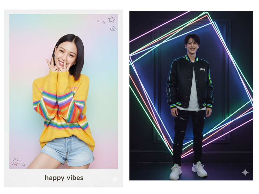 Untuk kesan modern dan berkelas, pilih gaya neon. Gunakan background gelap elegan, lalu tambahkan garis neon glowing warna-warni berbentuk frame 3D di belakang subjek. Fokuskan pencahayaan pada wajah agar terlihat seperti hasil studio, sementara bagian sekitarnya dibiarkan gelap untuk menambah kontras. Gaya ini cocok untuk nuansa photobox ala event atau pameran.