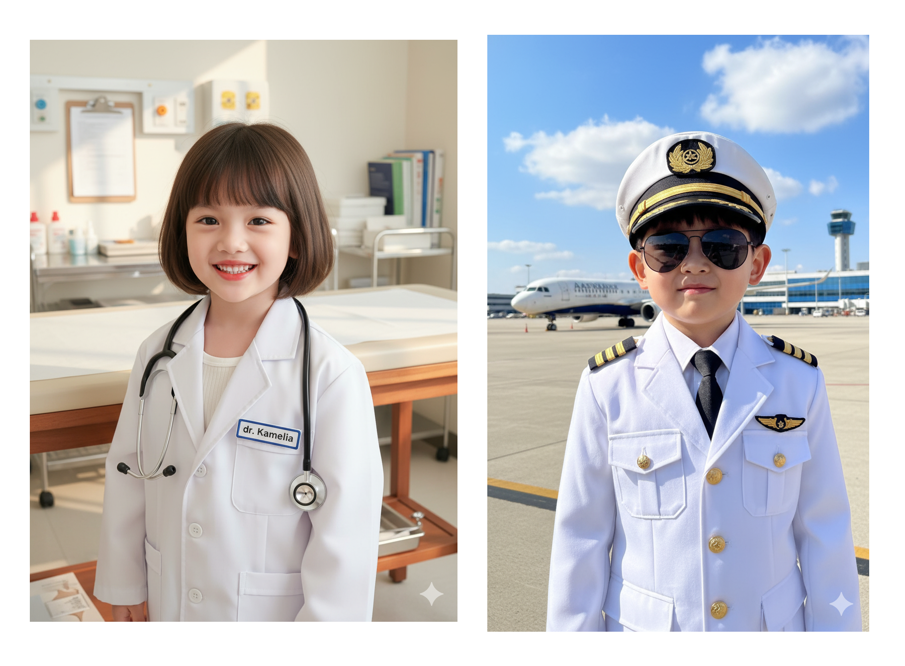 Salah satu tren yang ramai diikuti adalah mengubah foto anak menjadi versi mini dari profesi impian mereka, atau cita-cita di masa depan.