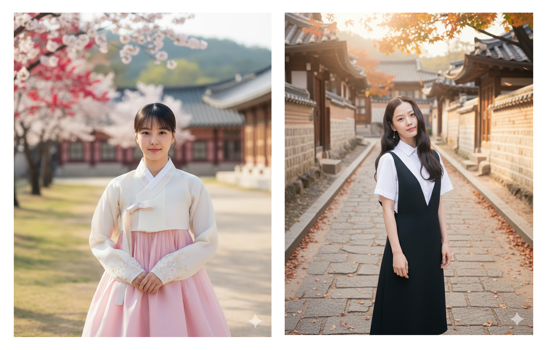 Dengan prompt Gemini AI, kamu bisa menambahkan berbagai elemen kreatif, seperti efek pencahayaan khas malam di Seoul, mempercantik tampilan hanbok, atau menghadirkan latar belakang Namsan Tower yang ikonik.