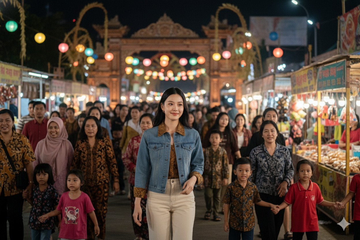 “Edit foto ini seolah aku hadir di festival Sekaten, suasana ramai dengan lampu dan hiasan tradisional, outfit casual dengan aksen batik, pencahayaan lembut malam hari, vibe festive dan cinematic, tone warna hangat dan colorful.”