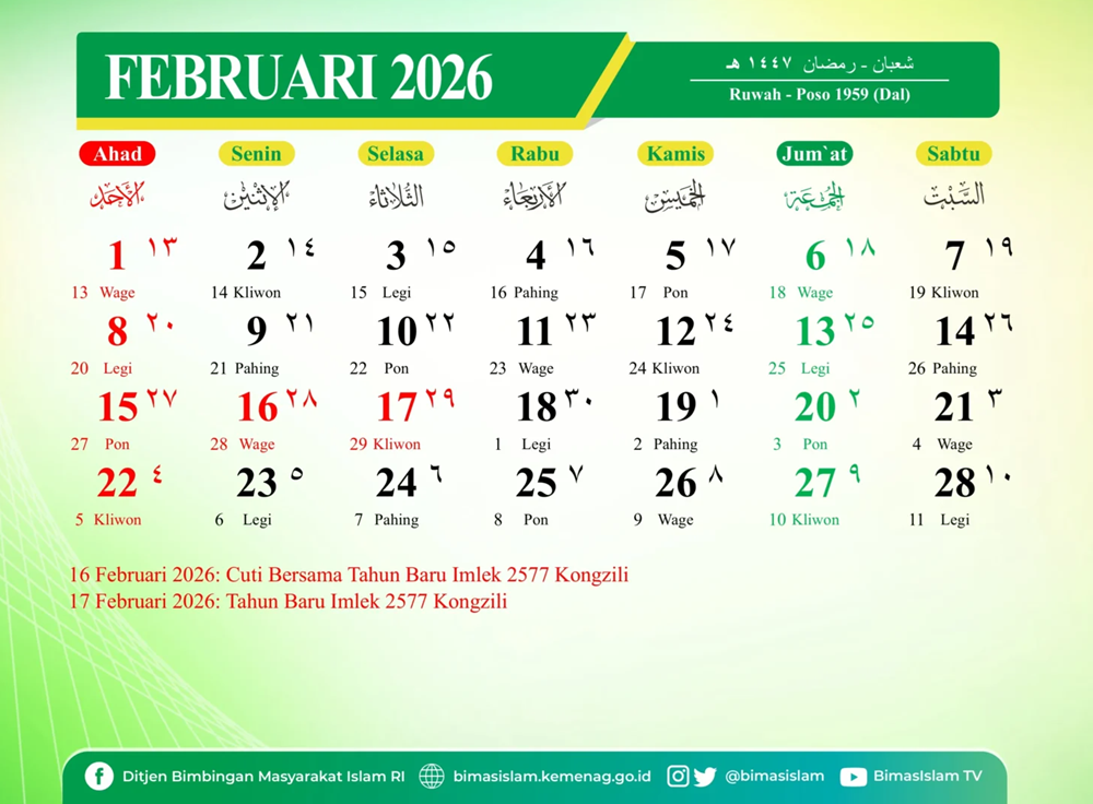 Mengacu pada Surat Keputusan Bersama (SKB) 3 Menteri Nomor 1497/2025, Nomor 2/2025, dan Nomor 5/2025, berikut rincian tanggal merah di bulan Februari 2026: