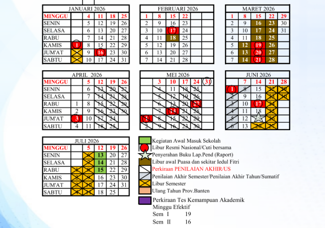 - Semester ganjil: 109 hari (19 minggu efektif)