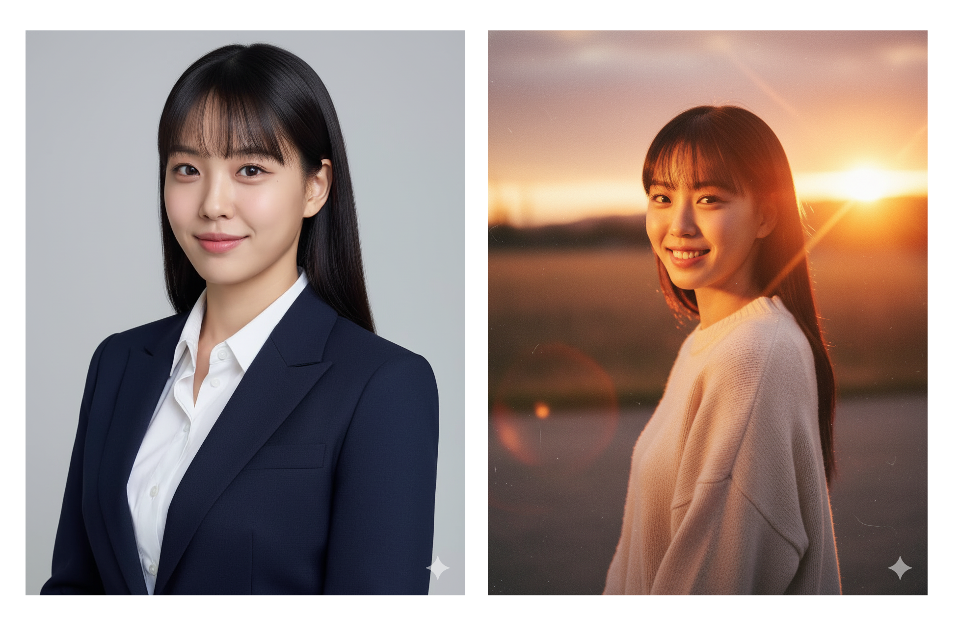 Ekspresi lembut dan natural, dengan efek flare sinematik yang realistis.