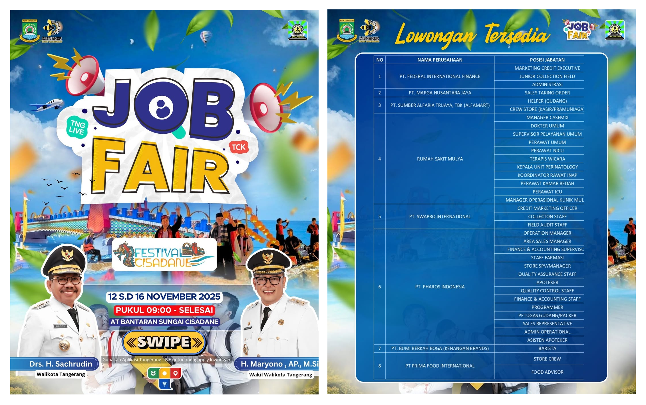 Menurut informasi dari akun resmi @tangerang_cakapkerja, Job Fair Tangerang 2025 ini diselenggarakan di Bantaran Sungai Cisadane, bersamaan dengan rangkaian Festival Cisadane 2025.