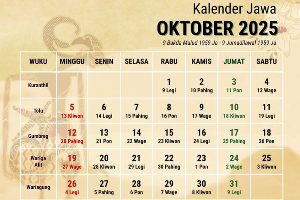Kalender Jawa Harian 6 Hingga 31 Oktober 2025