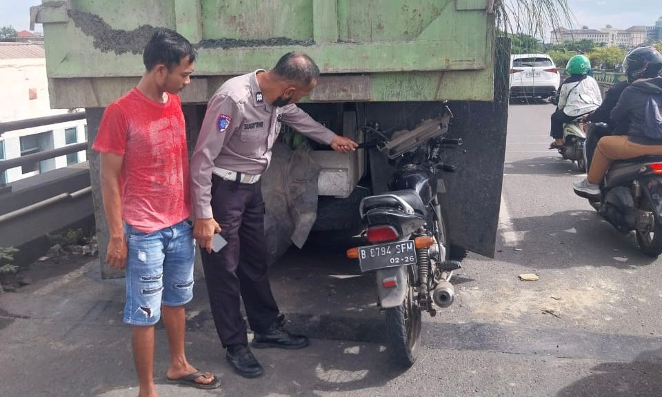 Karena tidak dapat menguasai laju kendaraannya, sepeda motor itu akhirnya menghantam bagian belakang truk yang terparkir.