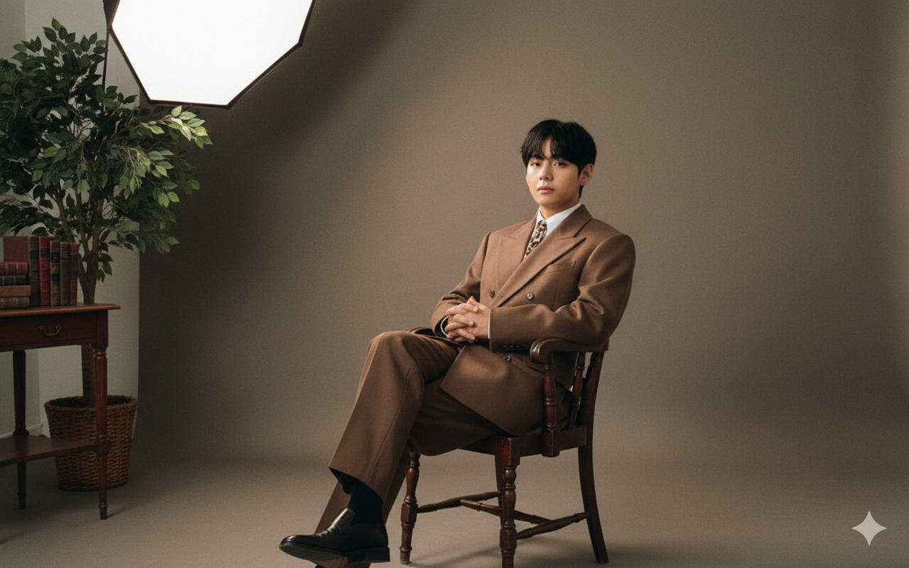 3. “Buat foto ini tampak seperti potret studio 90-an, pencahayaan lembut, pose santai di kursi kayu, dan interior klasik.”