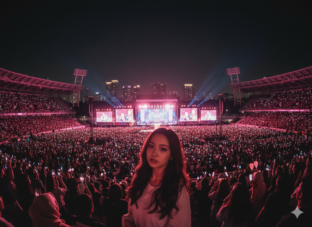 Pengambilan gambar lebar (wide shot): wanita berdiri di barisan tengah penonton konser Blackpink di Gelora Bung Karno. Panggung besar dengan layar LED menampilkan anggota Blackpink, langit malam Jakarta cerah, ribuan lampu ponsel berkilau. Warna pink dominan, tone sinematik natural dengan efek depth of field.