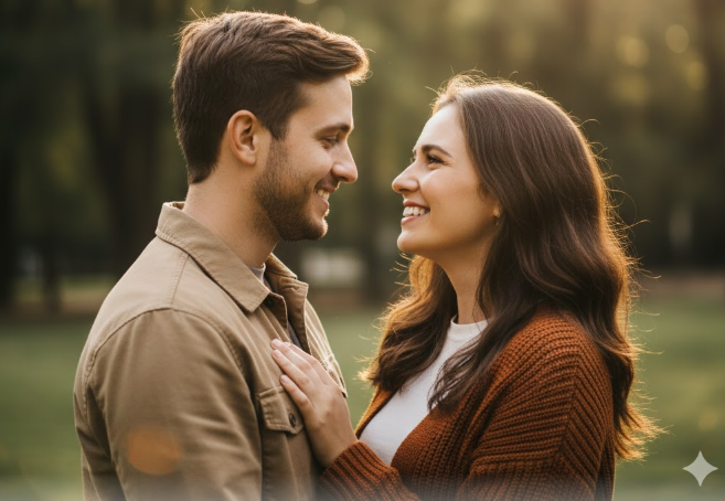 “Pasangan di taman kota saat sore hari, latar bokeh dedaunan, warna hijau earthy, flare cahaya alami dari sudut atas, ekspresi wajah bahagia.”