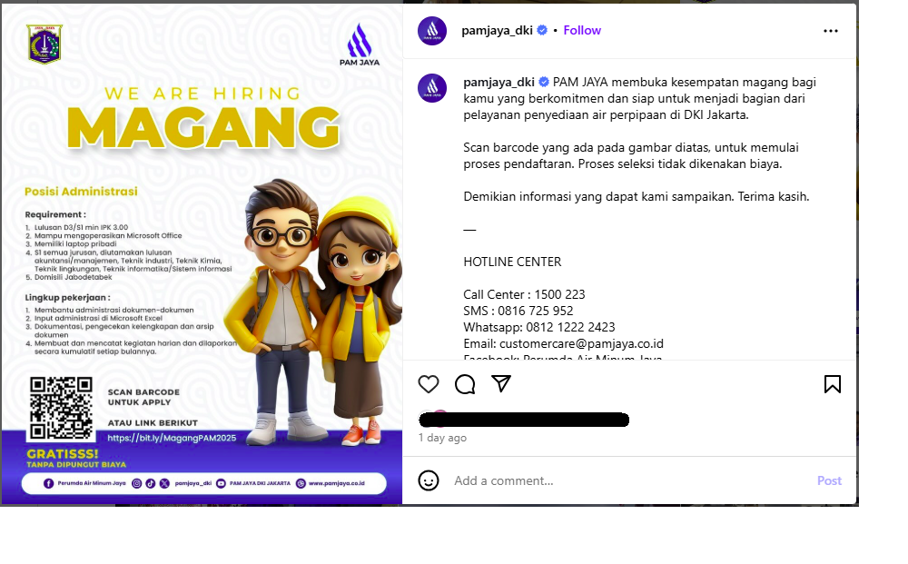 Informasi lebih lanjut mengenai rekrutmen dapat dilihat langsung melalui akun Instagram resmi @pamjaya_dki.