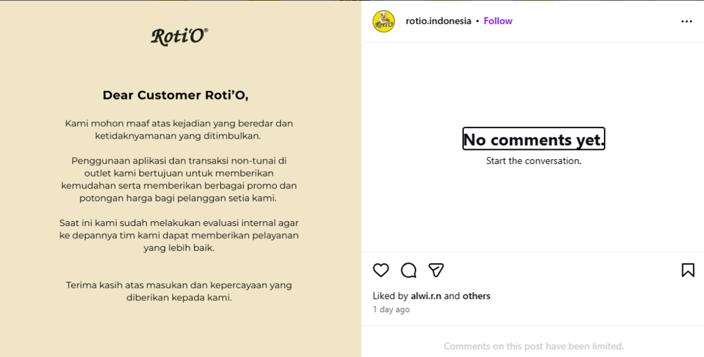 “Kami mohon maaf atas kejadian yang beredar dan ketidaknyamanan yang ditimbulkan,” tulis manajemen Roti O.