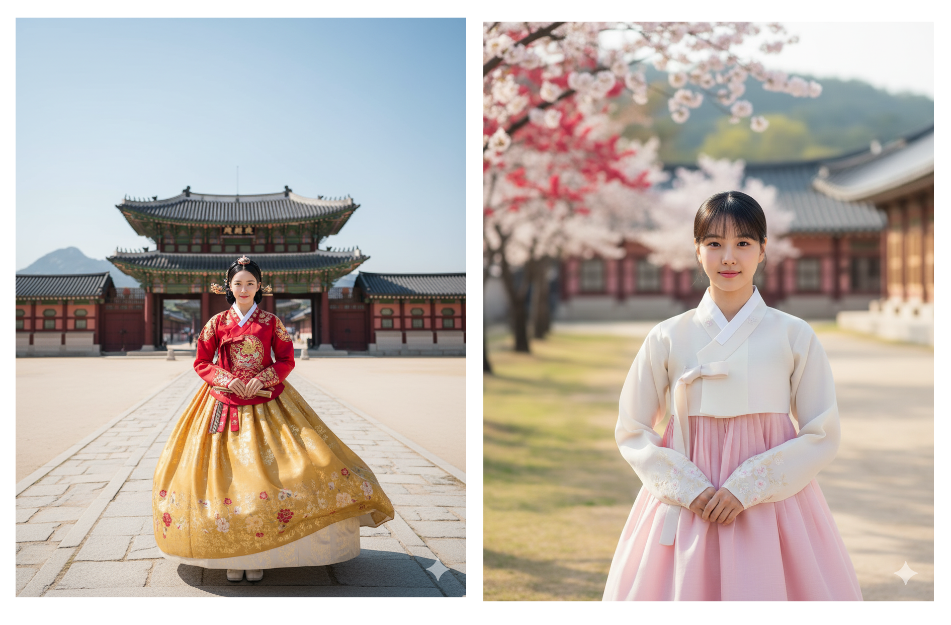 1. “Potret seorang wanita muda mengenakan hanbok tradisional berwarna pastel pink dan ivory, berdiri di halaman istana Korea saat musim semi, pencahayaan lembut pagi hari, kulit tampak alami, senyum tipis, latar belakang blur bergaya sinematik.”