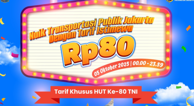 INFOTANGERANG.ID- Dalam rangka memperingati HUT ke-80 TNI, Pemerintah Provinsi DKI Jakarta resmi memberlakukan tarif transportasi publik hanya Rp80 selama sehari penuh hari ini, Minggu 5 Oktober 2025.