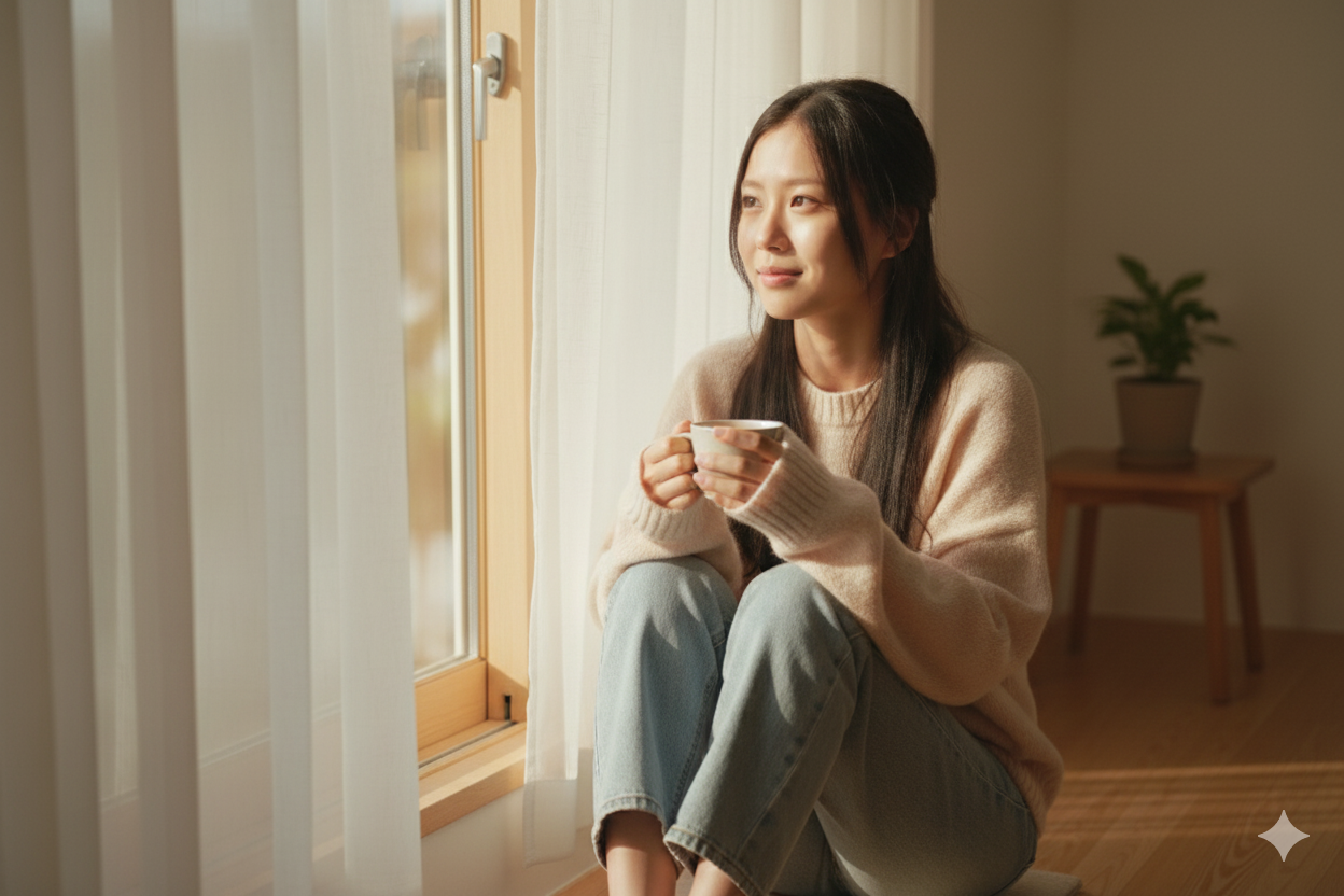 Edit foto saya menjadi potret wanita duduk santai di dekat jendela rumah minimalis. Cahaya sore alami menembus tirai tipis, memantul lembut di wajah. Memakai sweater oversized pastel dan jeans, memegang cangkir kopi. Interior bernuansa kayu muda dengan tanaman hijau kecil di samping. Latar belakang blur, pencahayaan hangat, ultra-realistic, detail kulit dan rambut natural.