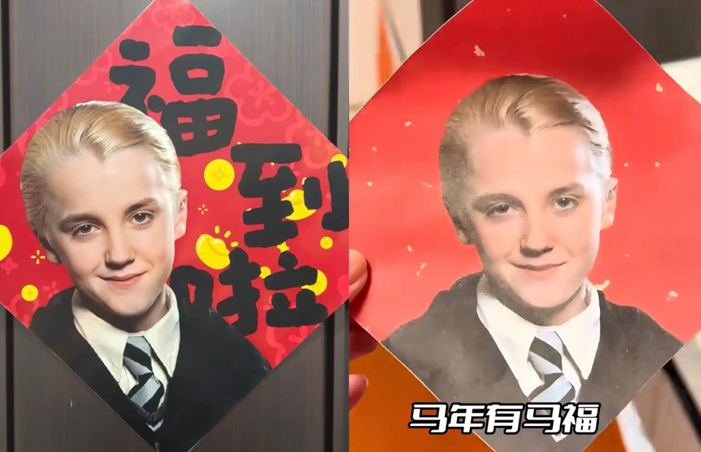 Wajah Draco Malfoy versi muda, yang diperankan oleh aktor Tom Felton, terlihat menghiasi rumah warga hingga etalase situs e-commerce yang menjual dekorasi Imlek.