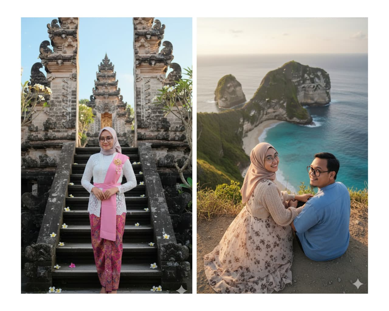 Cuma dengan masukan prompt foto liburan di Bali ini nggak perlu keluar biaya mahal buat tampil kece dengan latar ikonik Bali.